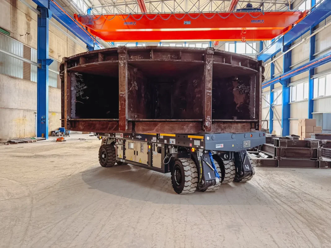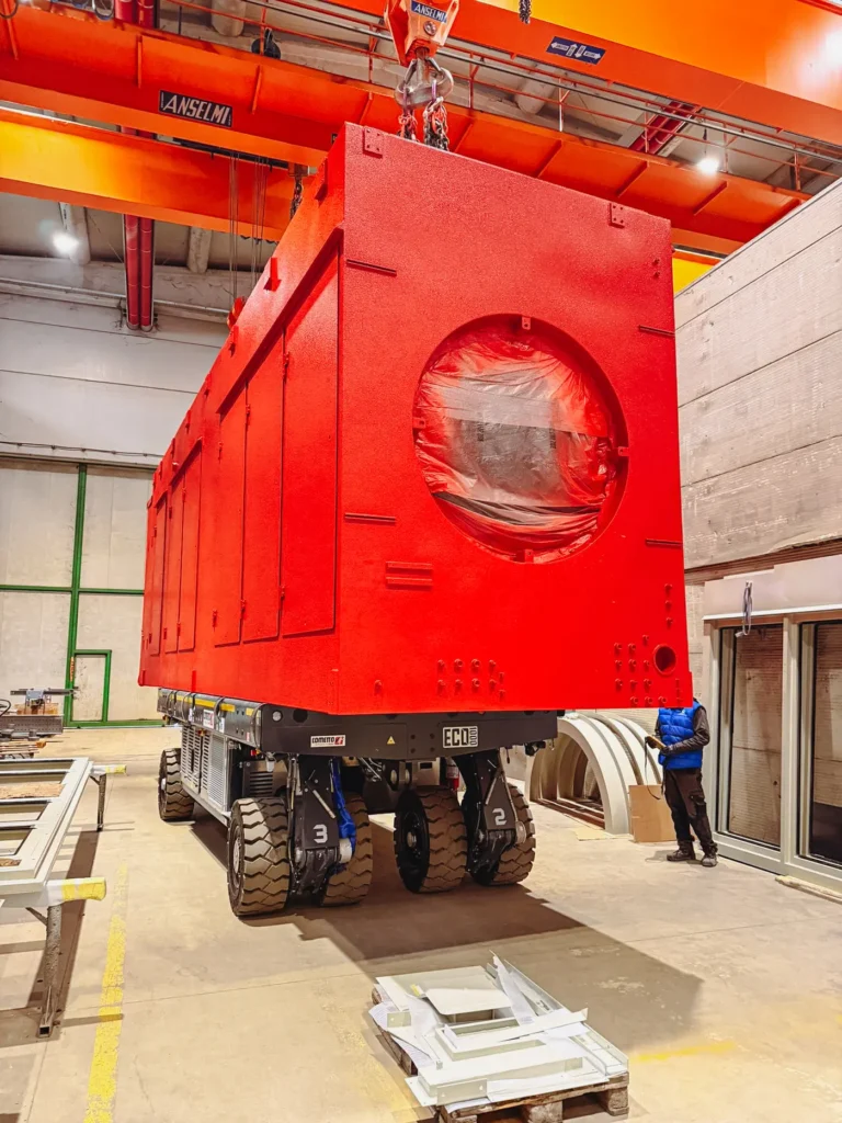 Il sistema Cometto è dotato di sterzatura elettronica di precisione, con una corsa di sollevamento di 700 mm, caratteristiche che permettono una gestione fluida ed efficiente delle operazioni nella movimentazione di componenti pesanti e fuori sagoma.