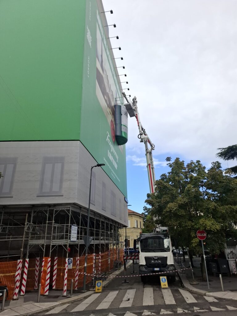 Per mascherare il cantiere e garantire al tempo stesso un forte impatto estetico, Amip ha realizzato una struttura di ponteggio autoportante  completamente rivestita da una maxi affissione che rappresentava una bottiglia Tanqueray tridimensionale, sporgente dalla facciata. Un effetto scenografico di grande suggestione, completato dall’impianto di illuminazione perimetrale e dagli interventi di messa in sicurezza del passaggio pedonale lungo la via.