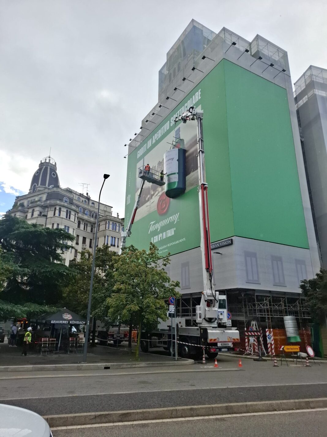 Per mascherare il cantiere e garantire al tempo stesso un forte impatto estetico, Amip ha realizzato una struttura di ponteggio autoportante  completamente rivestita da una maxi affissione che rappresentava una bottiglia Tanqueray tridimensionale, sporgente dalla facciata. Un effetto scenografico di grande suggestione, completato dall’impianto di illuminazione perimetrale e dagli interventi di messa in sicurezza del passaggio pedonale lungo la via.