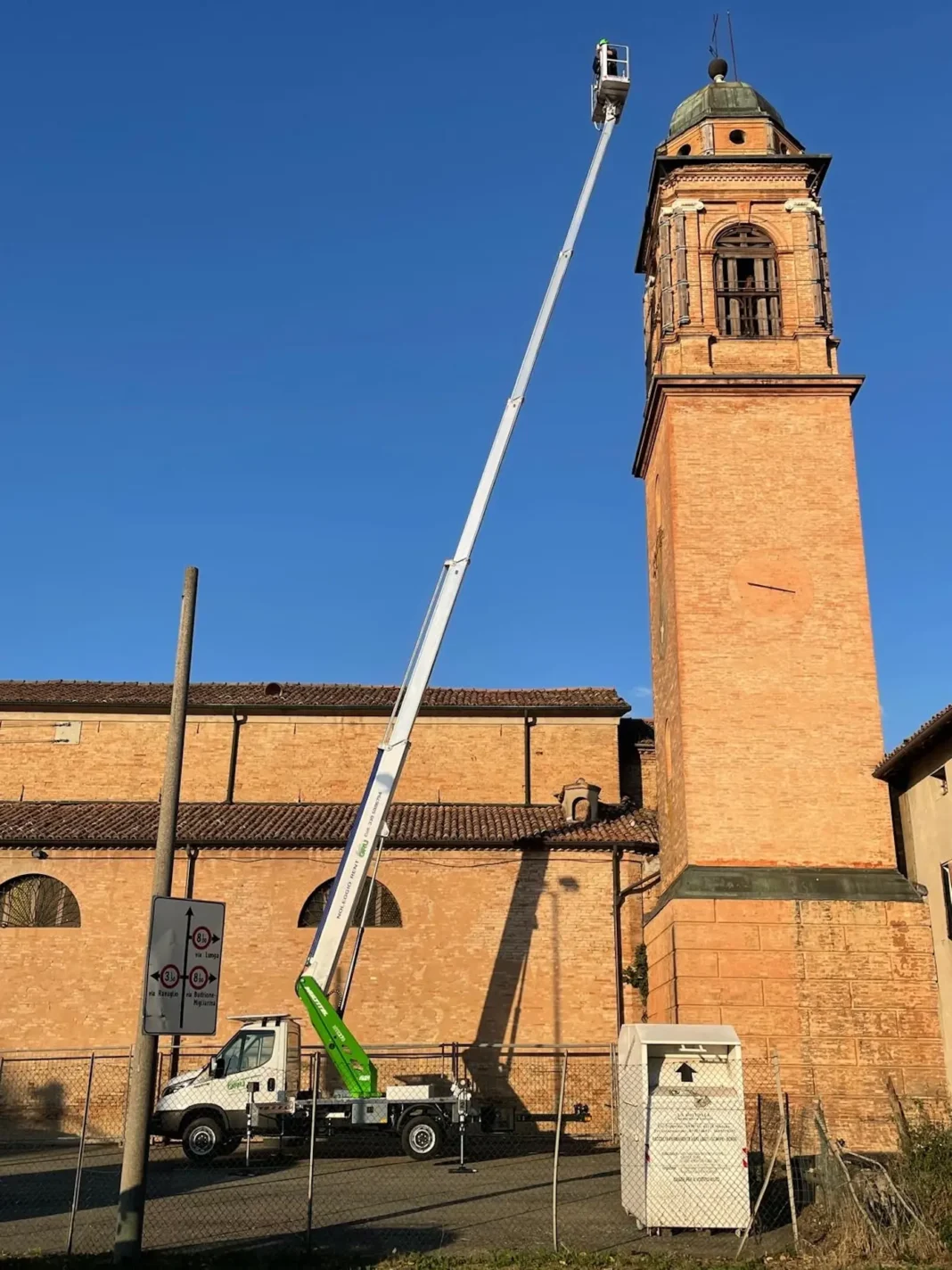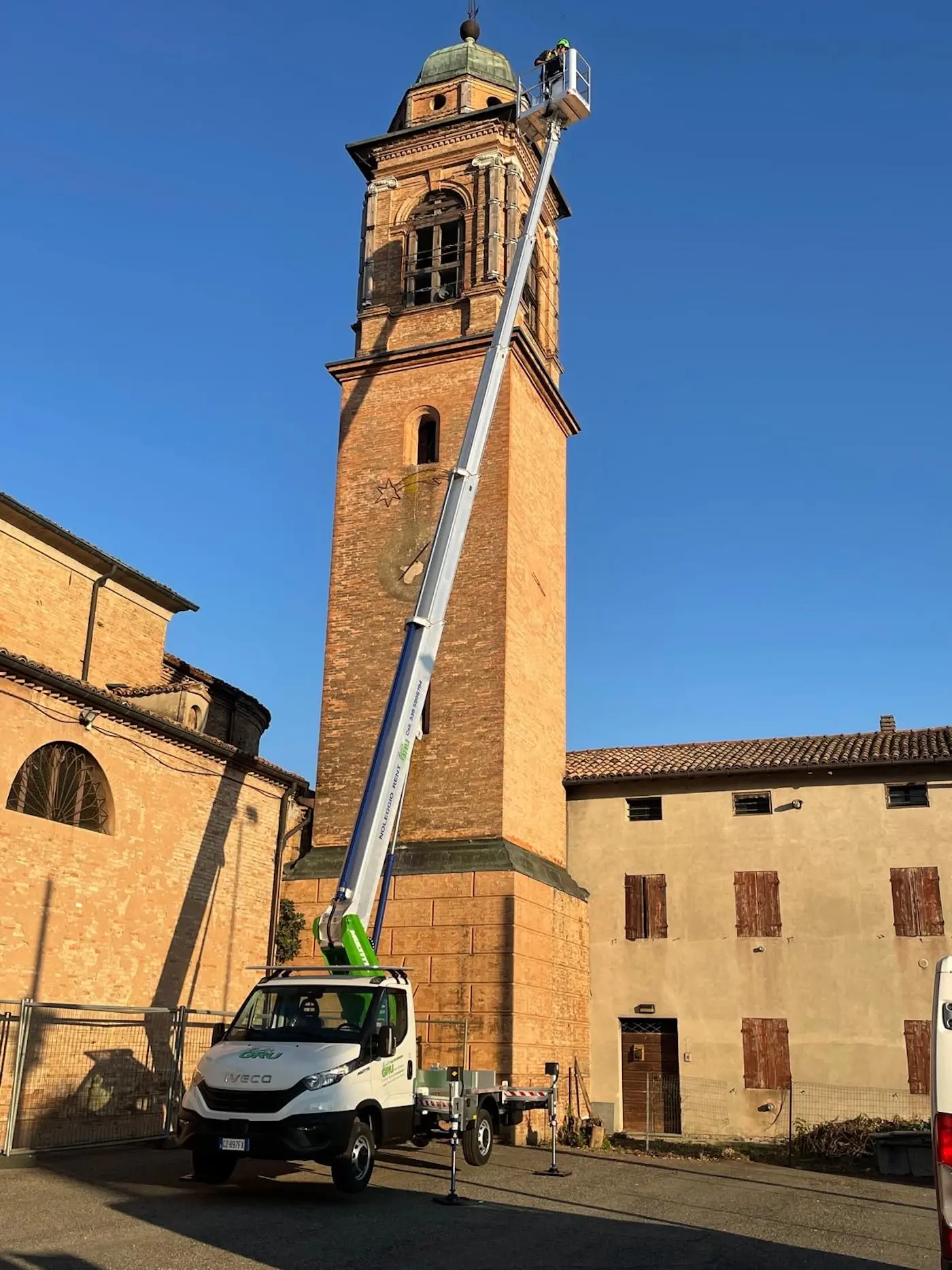 Il modello è stato impiegato per un’operazione di manutenzione sulla Chiesa di Santa Giulia a Migliarina di Carpi (Modena), edificio ottocentesco progettato da Achille Sammarini e danneggiato dal sisma che ha colpito l’Emilia nel 2012. L’intervento ha riguardato il campanile e la copertura, richiedendo l’utilizzo di una macchina in grado di operare con precisione e sicurezza in un contesto storico vincolato.