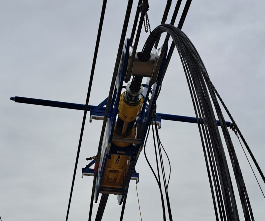 Il riposizionamento delle funi è una parte fondamentale della manutenzione della funivia. Poma desiderava ottimizzare il tempo necessario per l’operazione e, soprattutto, lasciare i cursori dei cavi in posizione tirando due funi portanti contemporaneamente. A tal fine, le due funi portanti sono state fissate a una trave di sollevamento, a sua volta collegata a un martinetto Enerpac HSL 20006. Azionando il martinetto, è possibile tendere i cavi fino a un massimo di 240 tonnellate con incrementi di 480 mm.